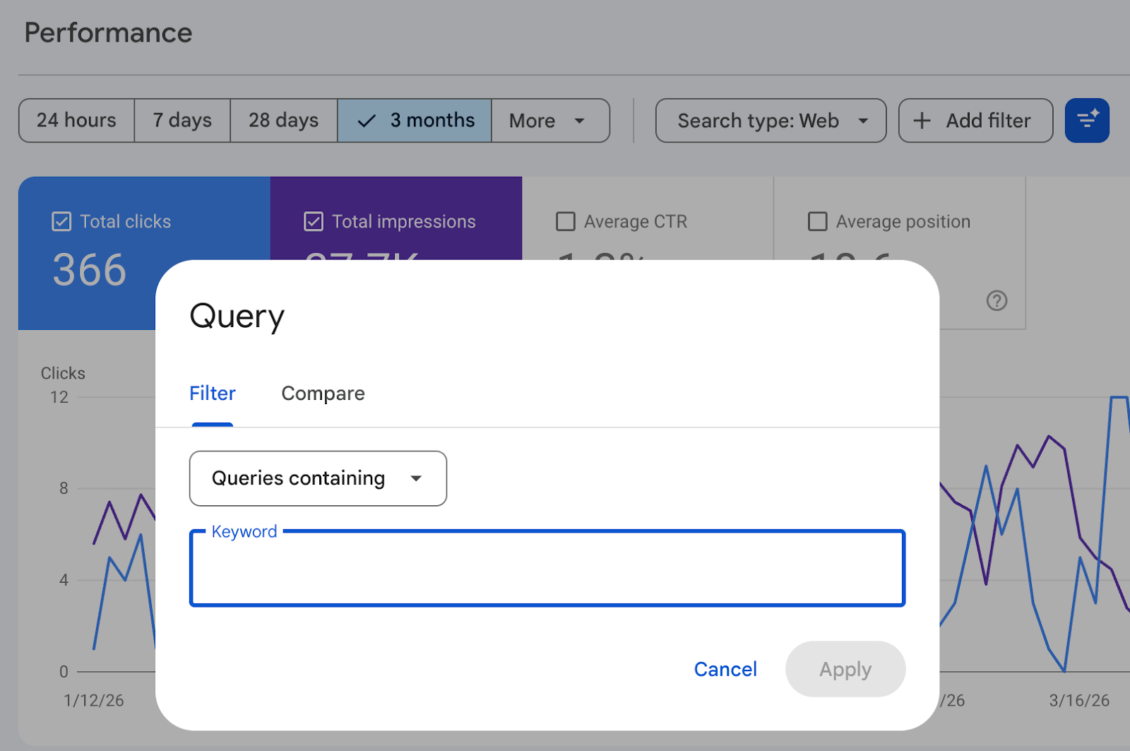 Search Console allows us to filter queries like this. Most people begin with a simple “contains” filter, and that's already a form of topic grouping because you're saying, “Show me searches that include this phrase.”