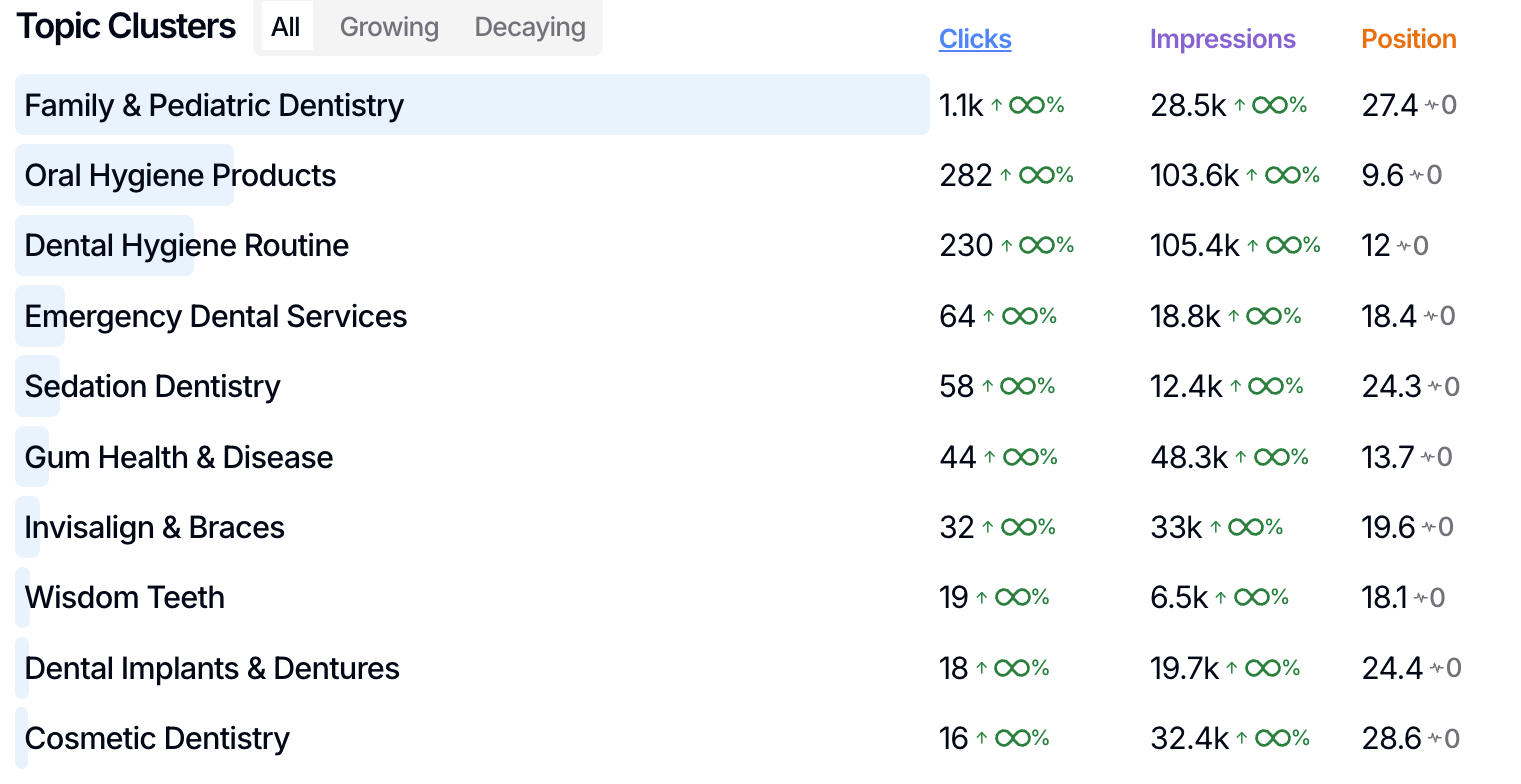 Topic-level visibility means evaluating a cluster of related searches as one bucket. Instead of asking, “Where do we rank for dental implants in our city?” you ask, “How visible are we for the implants topic overall?”